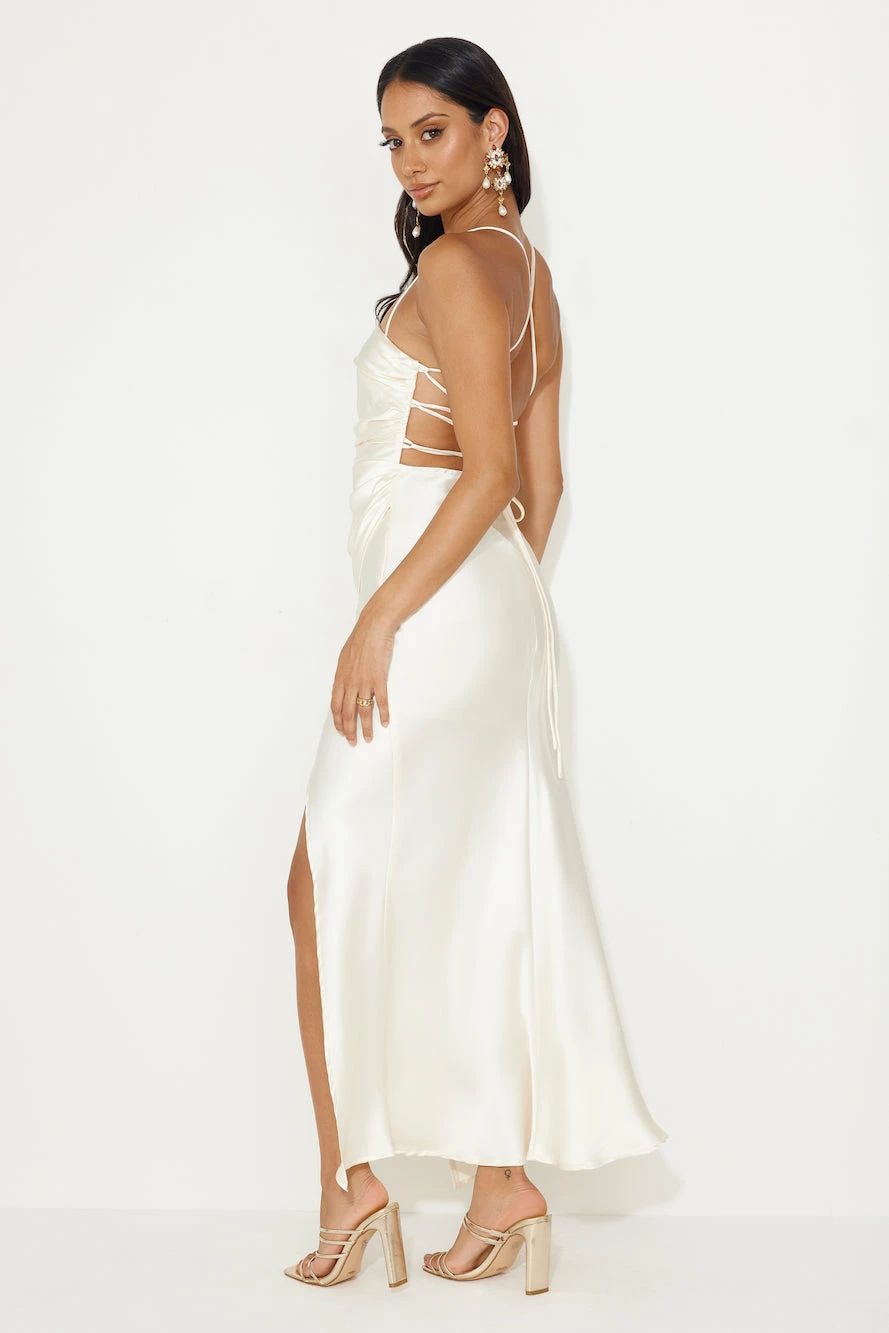 Dressed up and ready to go. The Best Friends Wedding Satin Midi Dress features boning to the bodice and a crisscross tie-up design. Style with heels and curls for a truly classy look.