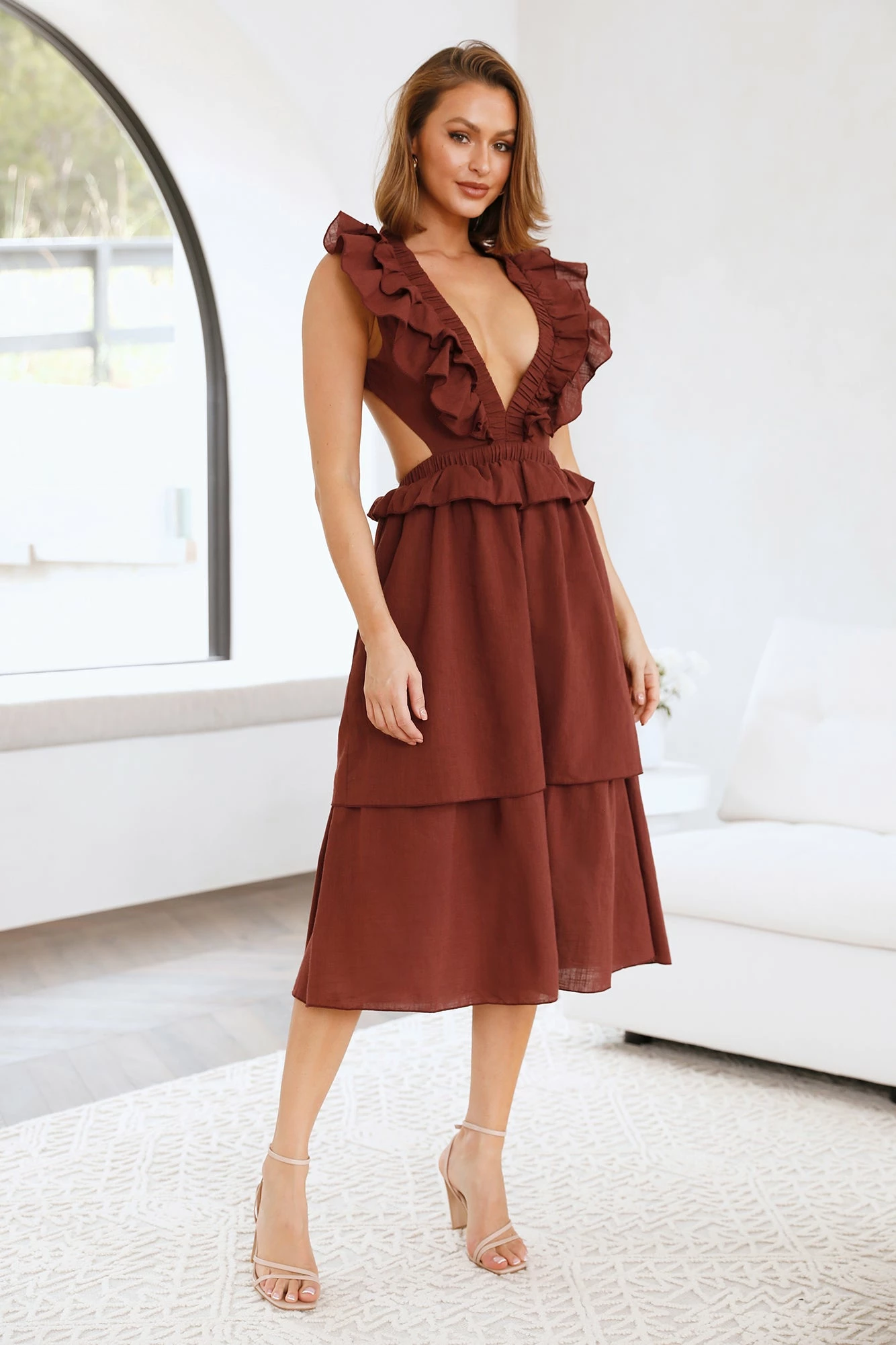 Have no other thoughts, no rhyme or reason and Dive Into Love with this statement maxi by your side. Featuring a tie-up plunging neckline with ruffles, an open back and a long length. Style yours with mules and gold earrings.
