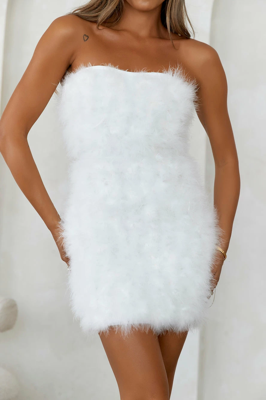 Introducing your newest obsession! The HELLO MOLLY Bring The Extravagance Feather Mini Dress features a bandage dress design with the softest fluffy feathers and a strapless bodycon fit. Style with heels to be admired all night long.