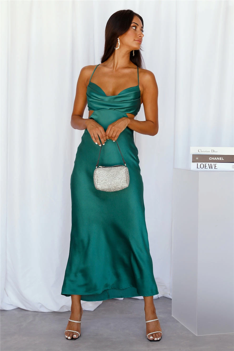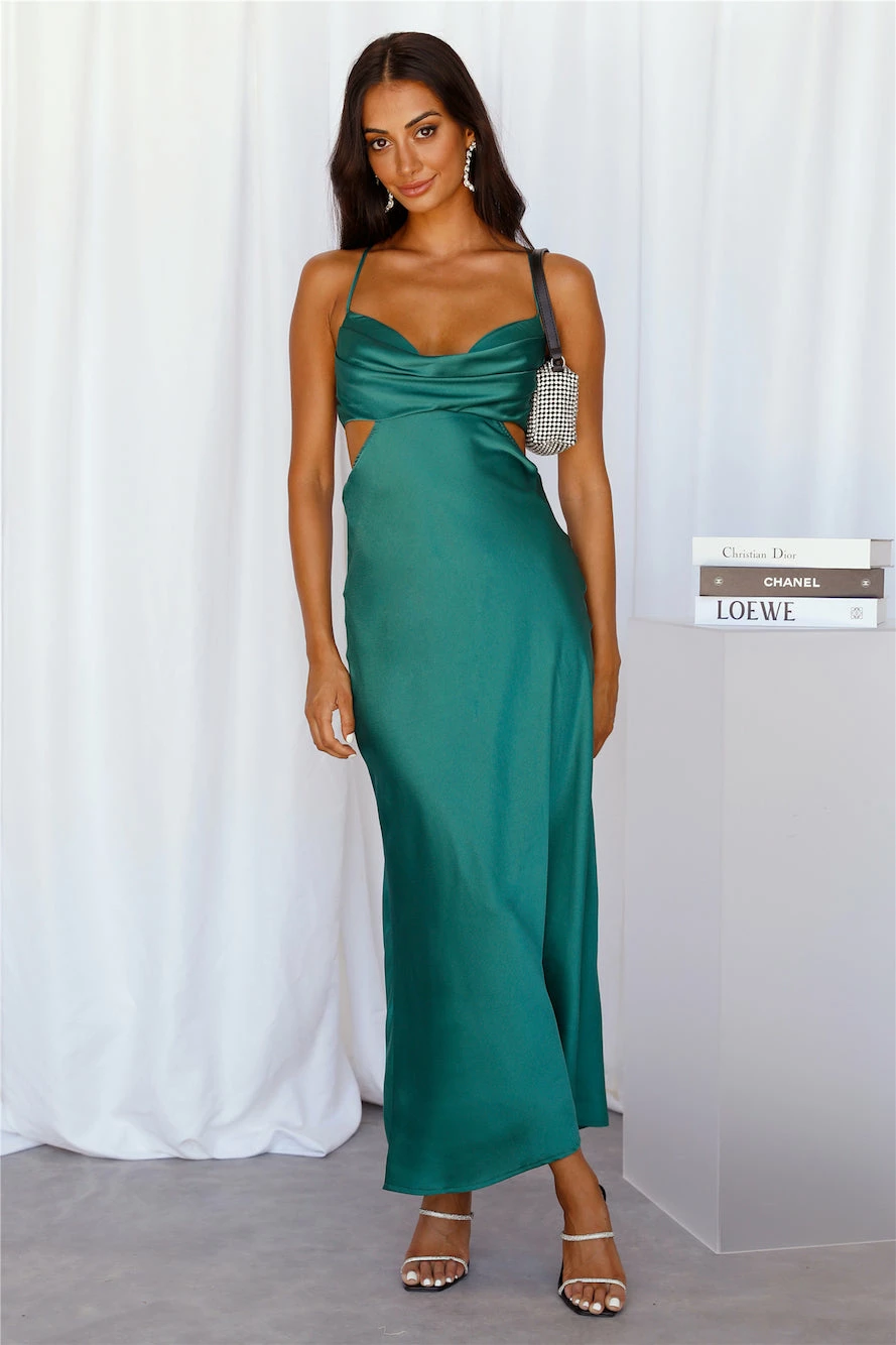 Get your glam on with the Purely Formed Maxi Dress! Show the world who’s in charge girl, by adorning this stunning maxi. Made of a lightweight luxe satin fabric, this must-have dress exudes elegance with its romantic cowl neckline and cheeky cutout details to the rear. No need to wear a bra babe as this cocktail dress comes with inbuilt bust cups. Weโre wearing ours with sky-high stilettos and sparkling adornments in our hair and ears.