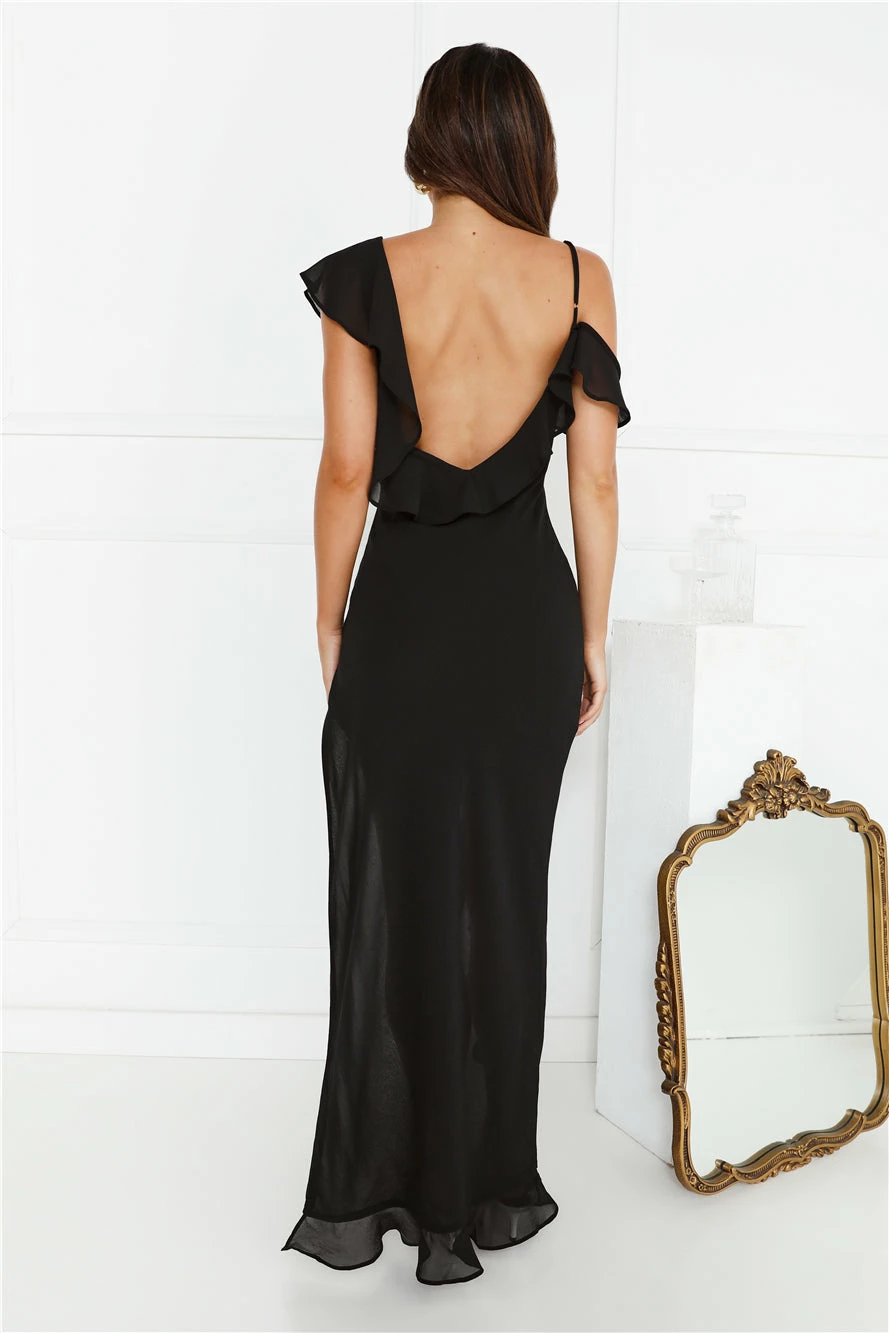 Step out in luxury with the RUNAWAY Vacanza Maxi Dress. Featuring a scoop neckline with frill detailing and a side leg opening. Style with heels for all the likes.