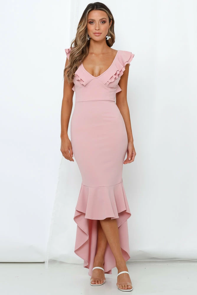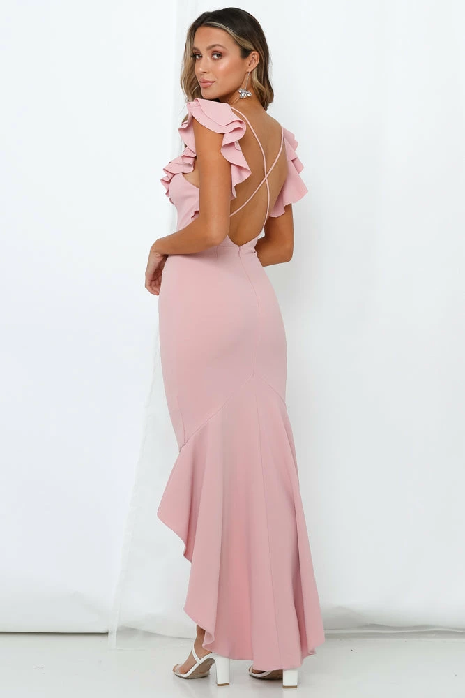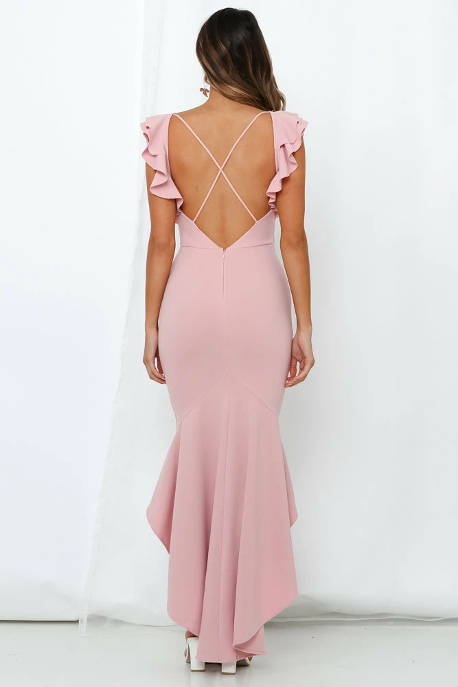 Gurrrl make some drama in this show stopping number! The Hills Maxi Dress features a hi-low ruffle hem, invisible back zipper, tubular crossover detailing on the back and a feminine v-neckline. We love wearing ours with a smokey eye, bold clutch and sleek high pony!
