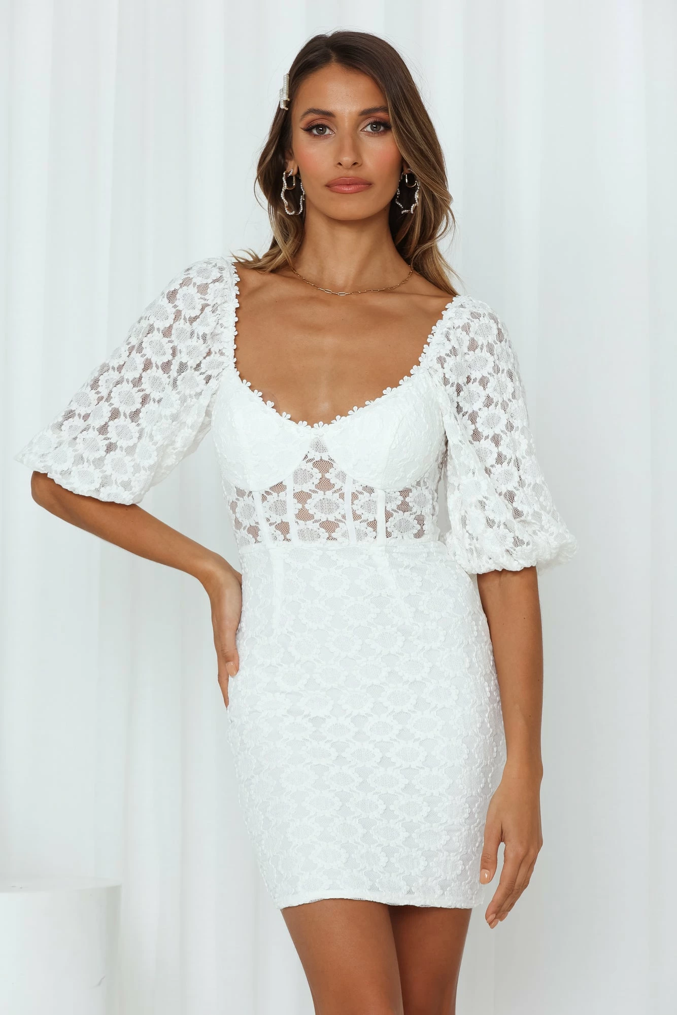 Lace up your lazy Sundays with the We Cute Dress. This florally dress is the perfect addition to any of your daytime adventures. The piece has a sheer bodice section along with an elegant off the shoulder design. And you won’t even need to wear a bra with it because it has a padded bust! Style yours with strappy heels and soft waves.